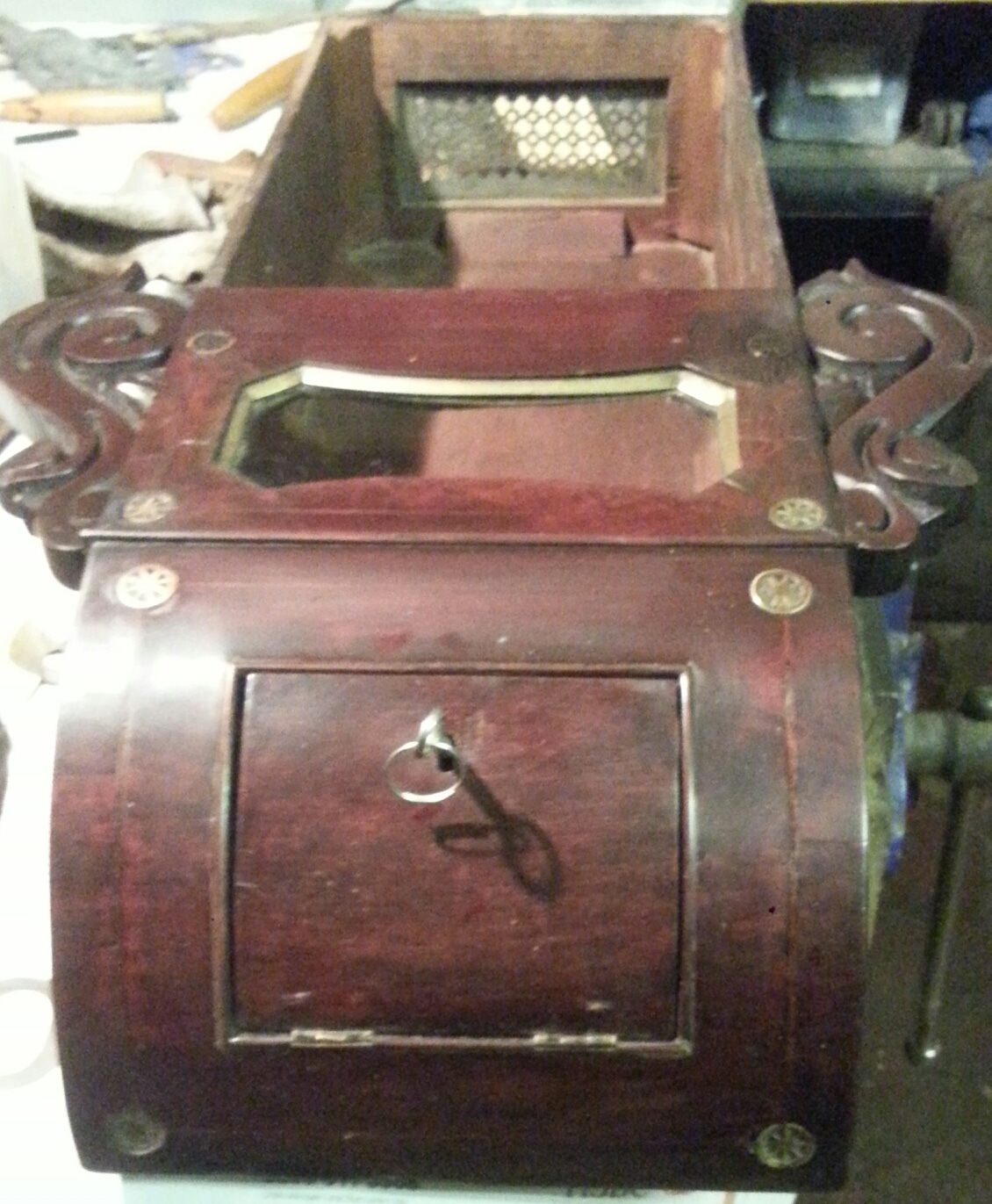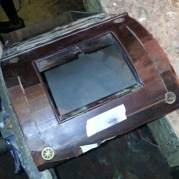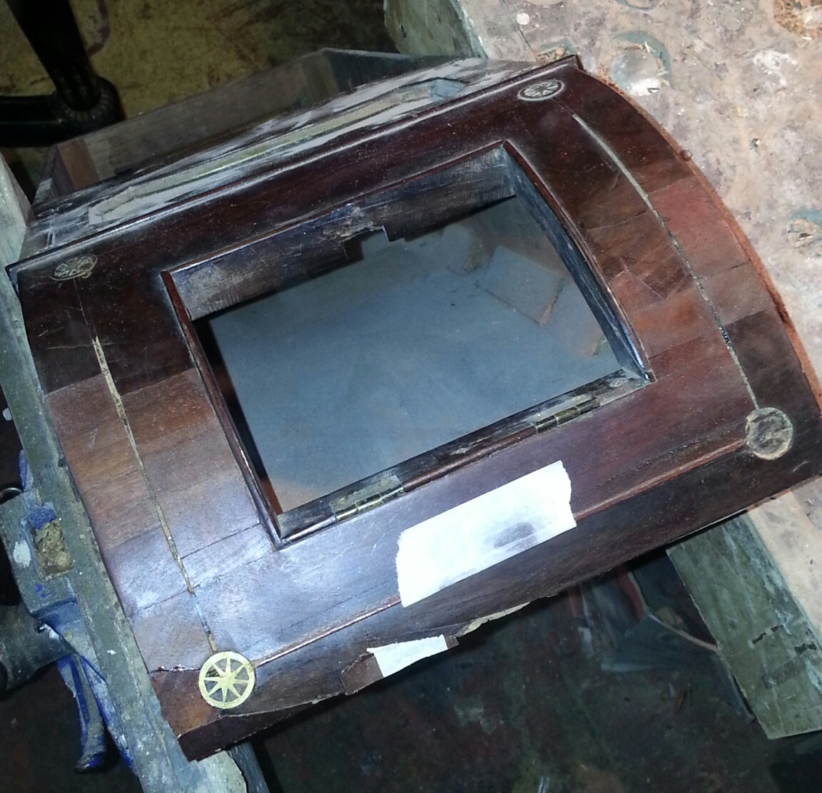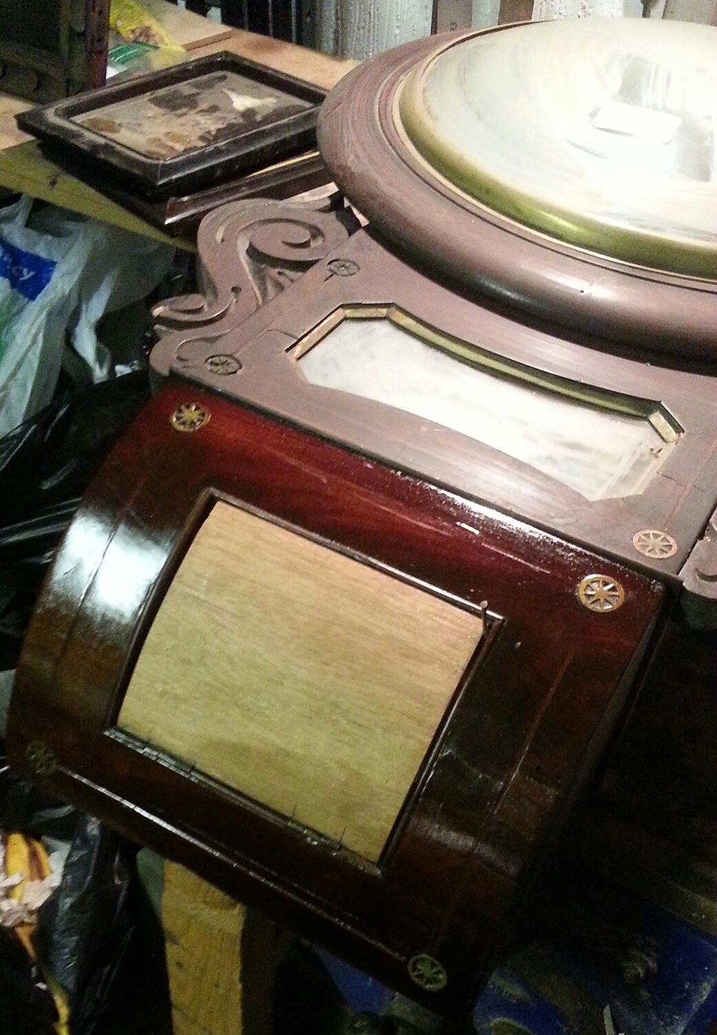 Restoration on 19th century dial clock constructed in mahogany veneer